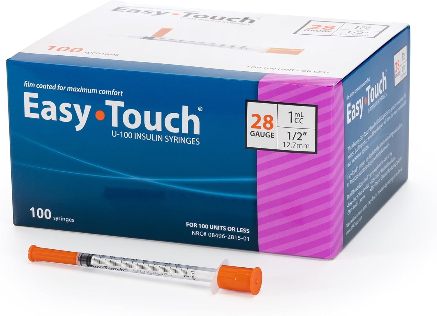 EasyTouch Insulin Syringes are manufactured for maximum comfort and ease of use. The 28-gauge needle is triple-bevel cut and electropolished for a smooth injection.